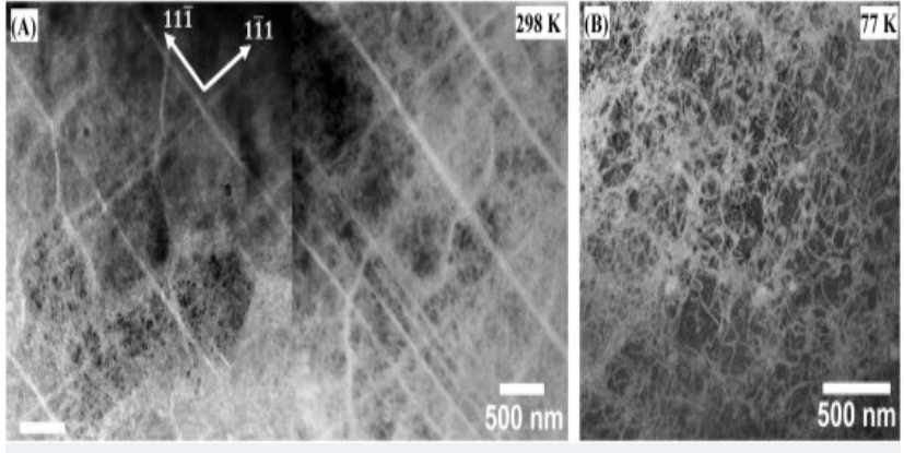 TEM图像显示,在298K时,( A )〈111〉平面滑移穿过试样裂纹尖端塑性区内部的胞状边界。( B )在77 K温度下测试的试样裂纹尖端塑性区内部的胞状结构和相对较高的位错密度。