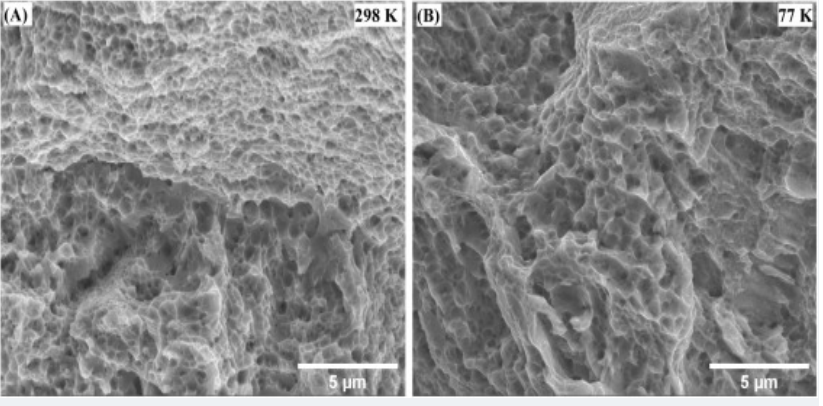在( A ) 298 K和( B ) 77 K下,拉伸试样的扫描电子显微镜( SEM )断口图显示微孔聚集。
