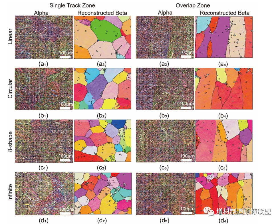 (1)随着激光振荡的增加,柱状晶粒变得更细,并且激光振荡越复杂,晶粒细化和柱向等轴转变(CET)的作用越明显。无限振荡的β晶粒尺寸在单径区减小了54.24%,在重叠重熔区减小了42.55%。无限振荡中HAGB含量在单轨区从80.96%增加到87.29%,在重叠区从79.47%增加到89.63%。