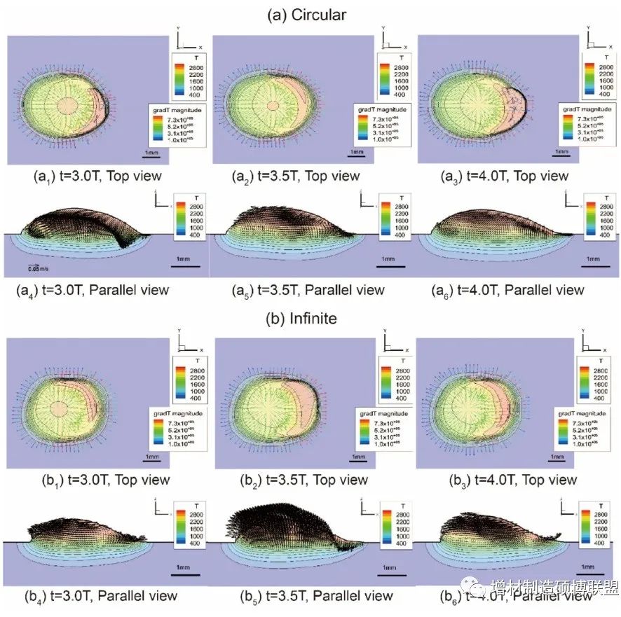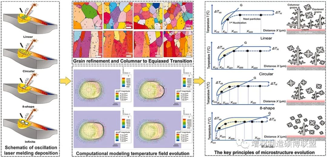 (4)讨论了温度变化和热场演化。随着激光振荡的增加,流体的流动速度幅度减小,速度方向发生变化,特别是在8形振荡和无限振荡中。激光振荡越复杂,熔池内的流动变化越剧烈。热梯度中的搅拌作用导致晶粒细化和等轴晶粒的形成。