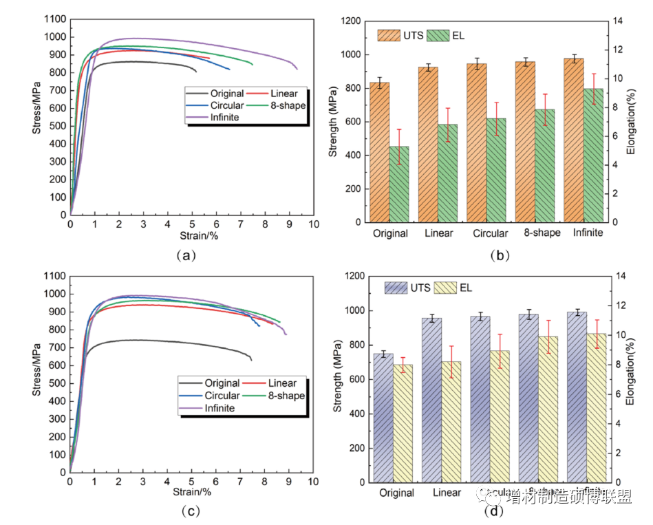(2)加入激光振荡后,材料的力学性能有所提高,尤其是无限振荡时。拉伸强度在平行和垂直方向分别提高了16.95%和32.37%,延伸率分别提高了83.60%和13.77%。特别是,无限的激光振荡产生了良好的抗拉强度和塑性的结合。