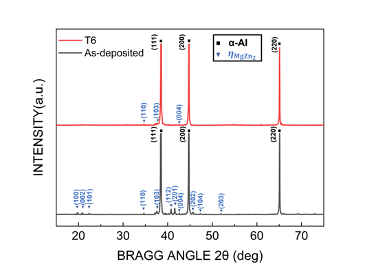 图7 7B55-Sc合金沉积态和T6热处理后的XRD图