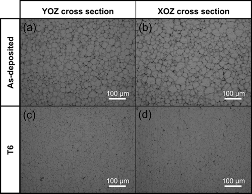 图3 7B55-Sc合金沉积态和T6热处理后不同截面的金相组织: (a, b) 沉积态下的YOZ和XOZ截面的金相组织; (c, d) T6热处理状态下的YOZ和XOZ截面的金相组织
