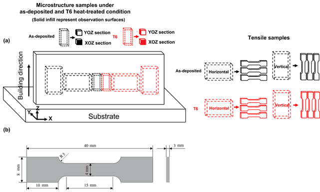 图2 (a)取样位置示意图; (b)拉伸试样尺寸