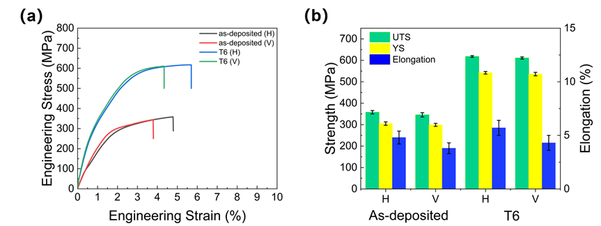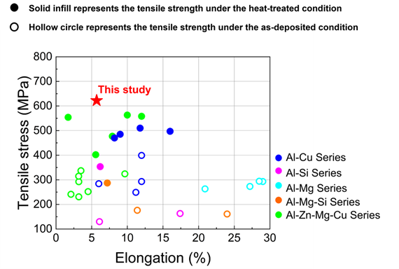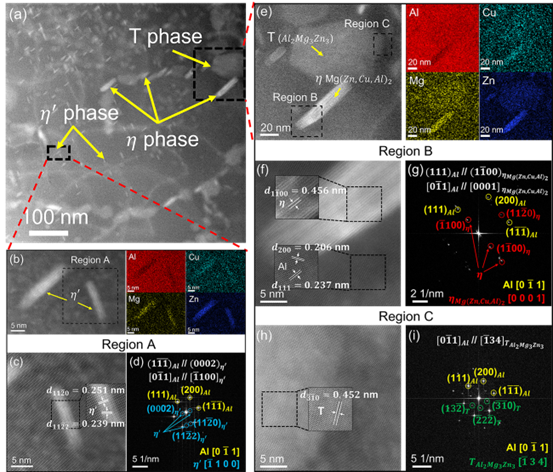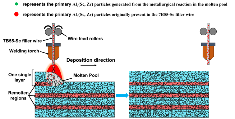01 全文速览 本研究采用研制的7B55-Sc铝合金丝材,利用冷金属过渡(CMT)电弧增材制造技术(WAAM)成功制备了无裂纹的Al-Zn-Mg-Cu-Sc铝合金构件,经T6热处理后,铝合金样件的抗拉强度达到618 MPa,在WAAM铝合金领域首次突破了600 MPa的强度级别。 02 研究背景 电弧增材制造(WAAM)是以电弧为热源,以丝材为填充材料,按照设定的路径逐层堆积,实现构件短流程、近成形的先进加工技术。它具有熔敷效率和材料利用率高的优点,非常适合于大尺寸金属构件的高效、快速制造。7系超高强度铝合金由于具有高的比强度、良好的耐蚀性和加工性能而广泛用于航空航天领域轻质、高强零部件的加工制造。然而现有的7系铝合金在熔化焊过程中极易产生热裂纹缺陷,被认为是“不可焊”铝合金。使用现有的铝合金丝材进行WAAM,很难获得无裂纹的具有超高强度的铝合金构件。因此,设计优化7系铝合金的化学成分,开发出适用于WAAW的超高强度铝合金专用丝材,已经成为突破大尺寸超高强度铝合金WAAW技术发展亟待解决的关键问题。 03 本文亮点 中科院金属所、澳大利亚伍伦贡大学以及沈阳航空航天大学等单位合作,通过设计优化7系铝合金丝材的化学成分,添加孕育剂Sc、Zr元素,优化熔炼工艺以及采用连续挤压成丝新技术,开发了一种适用于WAAM工艺的新型超高强度Al-Zn-Mg-Cu-Sc铝合金丝材,命名为7B55-Sc,采用CMT工艺成功制备了无裂纹的铝合金构件。经过T6热处理后,WAAM的7B55-Sc铝合金的抗拉强度达到了618 MPa,在WAAM铝合金领域首次突破了600 MPa的强度级别。其强化机理是: 凝固时形成的初生微米级的Al3Sc、Al3(Sc,Zr)颗粒在WAAM过程中作为非均质形核核心,促进了细小等轴晶组织的形成;而经T6热处理后,晶内析出大量的与基体保持共格关系的GP区、η′ 相和Al3(Sc,Zr)颗粒是WAAM 7B55-Sc铝合金具有超高强度的主要原因。研究成果有助于实现航空航天领域大尺寸、超高强度铝合金部件的快速增材制造的需求。相关论文以题为“ Microstructure and mechanical properties of 600 MPa grade ultra-high strength aluminum alloy fabricated by wire-arc additive manufacturing”发表在Journal of Materials Science & Technology。 04 图文解析 图1 (a) 7B55-Sc铝合金丝材; (b)WAAM系统; (c)无裂纹单道多层铝合金构件 图2 (a)取样位置示意图; (b)拉伸试样尺寸 图3 7B55-Sc合金沉积态和T6热处理后不同截面的金相组织: (a, b) 沉积态下的YOZ和XOZ截面的金相组织; (c, d) T6热处理状态下的YOZ和XOZ截面的金相组织 图4 7B55-Sc合金沉积态和T6热处理后的EBSD分析结果: (a, b, c, d) 沉积样品和 (e, f, g, h) T6热处理样品的EBSD IPF图、晶粒大小分布、晶界角分布和极图 图5 WAAM过程中等轴晶形成机理示意图 图6 7B55-Sc合金沉积态和T6热处理之后的BSE图像和点扫描结果: (a) 沉积状态 (b) T6热处理状态 图7 7B55-Sc合金沉积态和T6热处理后的XRD图 图8 7B55-Sc合金沉积态下晶内析出第二相的STEM结果: (a) 7B55-Sc合金沉积态下晶内STEM图像; (b) η′ 相的 HAADF-STEM图像和EDS图; (c,d) 区域A的放大图和 η′ 相的FFT; (e) ηMg(Zn,Cu,Al)2 相和 T 相的HAADF-STEM图像和EDS图; (f, g) 区域B的放大图和 ηMg(Zn,Cu,Al)2 相的FFT; (h, i) 区域C的放大图和 T 相的FFT 图9 7B55-Sc在T6热处理后晶内析出第二相的STEM结果: (a) 7B55-Sc合金在T6热处理后晶内STEM图像; (b) T6热处理之后的 η′ 相,GP区和次生Al3(Sc,Zr) 的HAADF-STEM图像和EDS图; (c, d) 区域D的放大图和次生Al3(Sc,Zr) 的FFT; (e) 次生Al3(Sc,Zr) 的壳核结构 图10 7B55-Sc合金在沉积态和T6热处理条件下的拉伸性能: (a) 7B55-Sc合金在水平和垂直方向的工程应力-应变曲线; (b) 拉伸试验结果统计 图11 WAAM增材制造不同铝合金的强度和伸长率对比 图12 7B55-Sc合金沉积态和T6热处理的断口形貌: (a) 沉积状态下的水平和 (b)竖直方向的断口形貌 (c) T6热处理状态下的水平和 (d) 竖直断口形貌 05 结论展望 (1) 7B55-Sc合金在沉积态和T6热处理条件下的微观组织均是由细小的等轴晶组成,T6热处理后晶粒无粗化现象,平均晶粒尺寸约为6.0 μm。 (2) 沉积态条件下,初生的Al3(Sc,Zr) 颗粒在凝固过程中作为非均质形核核心,促进了细小等轴晶的形成。在T6热处理后析出的次生纳米级的Al3(Sc,Zr) 颗粒不仅提高了铝合金的热稳定性,阻碍晶粒长大,而且具有析出强化作用。 (3) 在沉积态条件下,晶界析出了大量连续的共晶组织,晶内析出相为 η' 相、η 相和 T 相。T6热处理后,分布于沿晶界的共晶组织大部分溶入到Al基体中,而晶内析出了大量的GP区、η' 相和次生的Al3(Sc,Zr) 颗粒,导致强度显著提高。 (4) T6热处理后,试件水平方向的平均UTS、YS和伸长率分别为618±4MPa,542±6MPa和 5.7%±0.7%。抗拉强度成功突破了600 MPa,这是迄今报道的WAAM铝合金中强度最高水平。