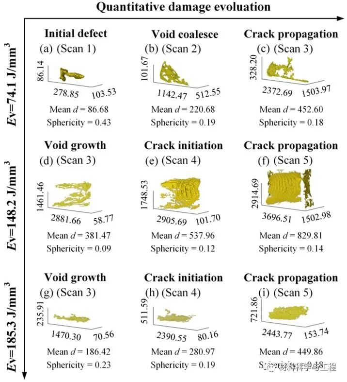 图7. 原位拉伸试验中裂纹体积、平均等效直径以及球度的定量分析:(a-c)Ev=74.1J/mm3,(d-f)Ev=148.2J/mm3,(g-i)Ev=185.3J/mm3。