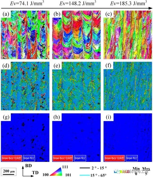 图1. 不同LPBF工艺参数下制备的因瓦合金显微组织:(a-c)EBSD-IPF图,(d-f)EBSD-KAM图,和(g-i)EBSD-相图。