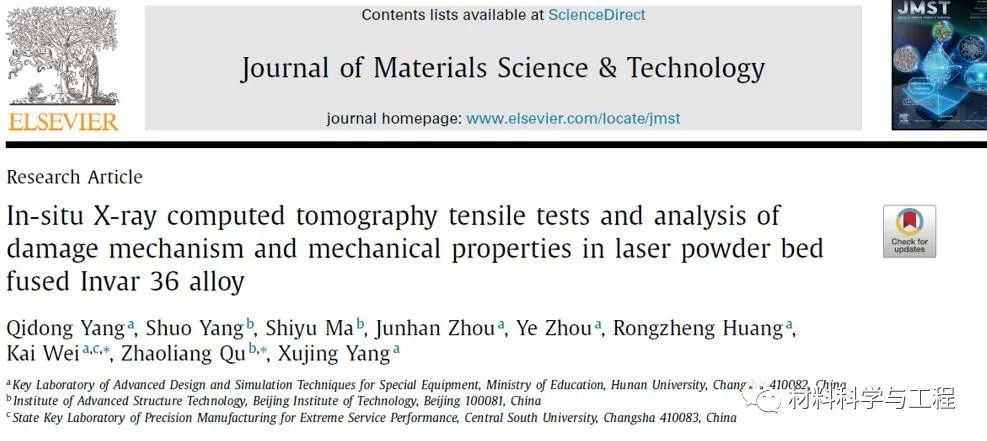 近期,湖南大学韦凯与北京理工大学曲兆亮研究团队在方岱宁院士的指导下采用LPBF工艺制备了因瓦合金,首次利用原位X射线断层扫描技术对其拉伸力学行为进行了深入研究,并建立了LPBF制备的因瓦合金其工艺参数-微观结构(微观组织和孔隙缺陷)-力学性能的关联规律,对实现LPBF工艺制备的因瓦合金在航空航天等领域的广泛应用具有重要意义。该研究成果以“In-situ X-ray computed tomography tensile tests and analysis of damage mechanism and mechanical properties in laser powder bed fused Invar 36 alloy”为题发表于期刊《Journal of Materials Science & Technology》。
