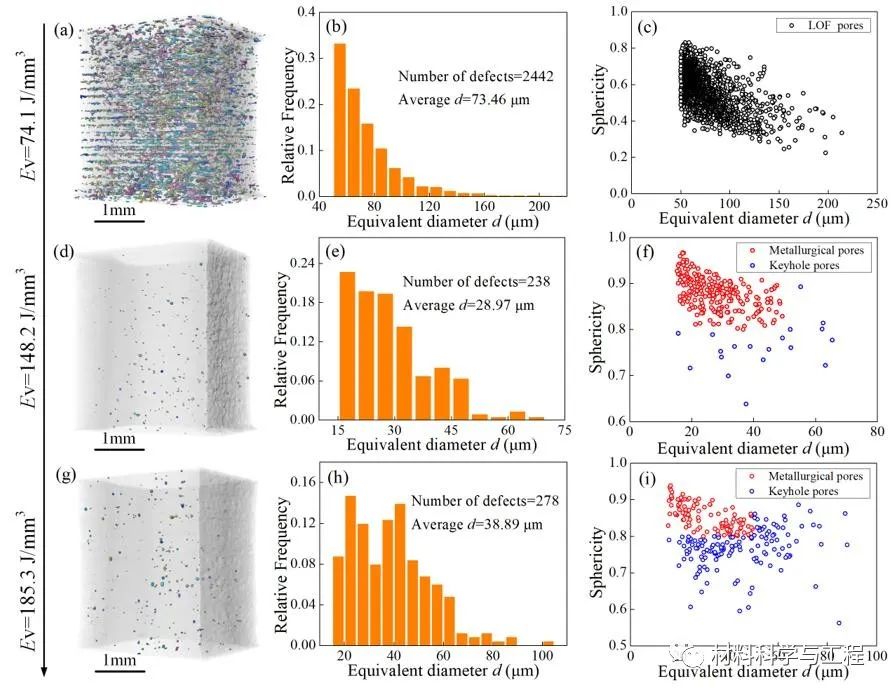 图2. 不同LPBF工艺参数下制备的因瓦合金样件内部缺陷:(a, d, g)三维形貌和分布,(b, e, h)相对频率,和(c, f, i)球形度分析。
