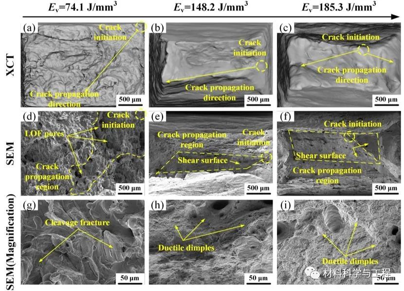 图8. 不同LPBF工艺参数下制备的因瓦合金样件断口形貌:(a-c)CT形貌展示了裂纹源位置以及裂纹扩展方向,(d-f)SEM形貌展示了裂纹源位置以及裂纹扩展区域,(g-i)高倍SEM形貌展示了解理断裂以及韧窝。