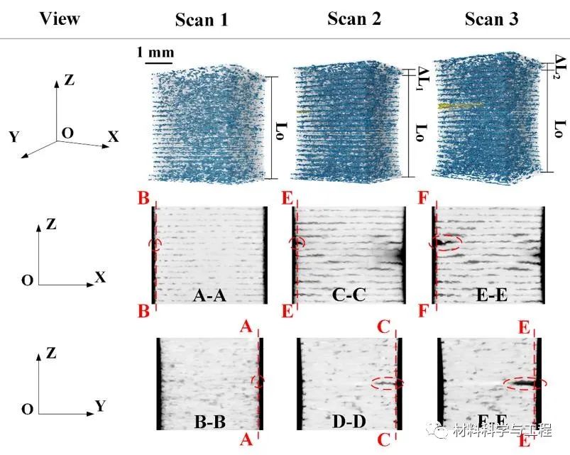 图4. 原位拉伸试验中激光能量密度Ev=74.1J/mm3下制备样件标距段内的孔隙缺陷演化(图中半透明的灰色表示实体部分,蓝色表示孔隙缺陷,黄色表示导致失效的缺陷或裂纹)以及在XOZ和YOZ截面中观察到的裂纹扩展。扫描1是在施加载荷前获得的初始阶段,扫描2和3是在拉伸加载过程中获得的。