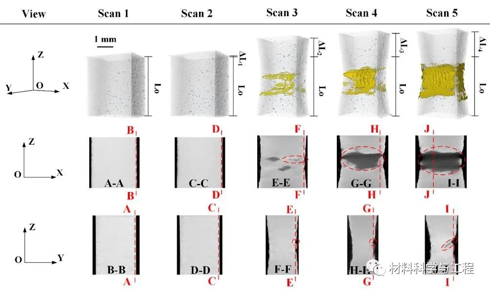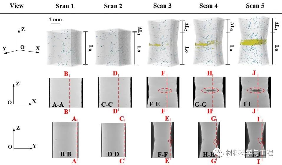 图6. 原位拉伸试验中激光能量密度Ev=185.3J/mm3下制备样件标距段内的孔隙缺陷演化(图中半透明的灰色表示实体部分,蓝色表示孔隙缺陷,黄色表示导致失效的表面凹陷和裂纹)以及在XOZ和YOZ截面中观察到的裂纹扩展。扫描1是在施加载荷前获得的初始阶段,扫描2-5是在拉伸加载过程中获得的。