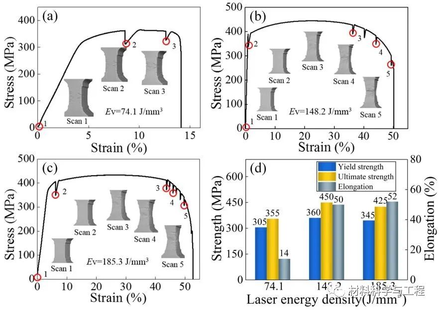 图3. 不同LPBF工艺参数下制备的因瓦合金样件的原位拉伸应力-应变曲线和标距段的变形演化(a)Ev=74.1J/mm3,(b)Ev=148.2J/mm3,(c)Ev=185.3J/mm3,和(d)各样件强度与延伸率的对比图。