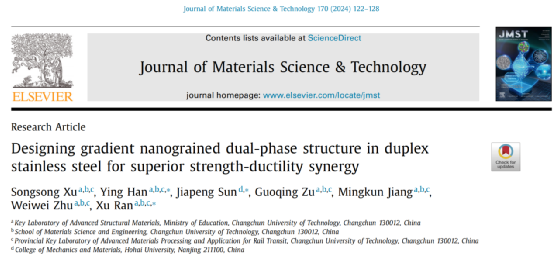 近日,长春工业大学冉旭课题组与河海大学相关团队的合作成果以“梯度纳米双相结构实现双相不锈钢优异强塑性(“Designing gradient nanograined dual-phase structure in duplex stainless steel for superior strength-ductility synergy”)”为题发表在材料领域权威期刊Journal of Materials Science & Technology (IF=10.9)上。长春工业大学博士研究生许松松为第一作者,韩英、冉旭教授以及河海大学孙甲鹏副研究员为共同通讯作者。