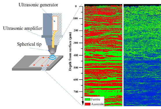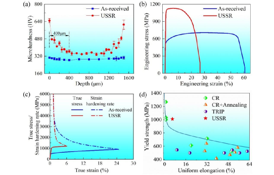 金属结构材料强度的提高往往以牺牲塑性为代价,反之亦然。如何协调强塑性矛盾是金属材料领域的核心问题和研究热点。双相不锈钢作为一种广泛使用的金属结构材料,兼有铁素体和奥氏体不锈钢的优势,如塑韧性好、耐局部腐蚀性强、焊接性能优异等。常规方法(例如轧制等)在提高双相不锈钢强度的同时往往带来塑性的急剧下降,强塑性矛盾表现突出,严重影响了其工程应用。研究团队提出构筑梯度纳米双相异质结构的策略以改善双相不锈钢的强塑性,并发展了超声表面深滚压组合低温短时退火的制备方法。研究表明,梯度纳米双相异质结构通过梯度纳米结构和层状双相结构的相互嵌套形成了显著的微观组织异质性,促进了变形过程几何必须位错的积累,提高了异质变形诱导强化和应变硬化作用。室温单轴拉伸实验表明,梯度纳米双相异质结构2101不锈钢获得了约1 GPa的屈服强度和约23.4%的延伸率。本研究为开发兼具高强度和高塑性的先进结构钢提供了新的思路。