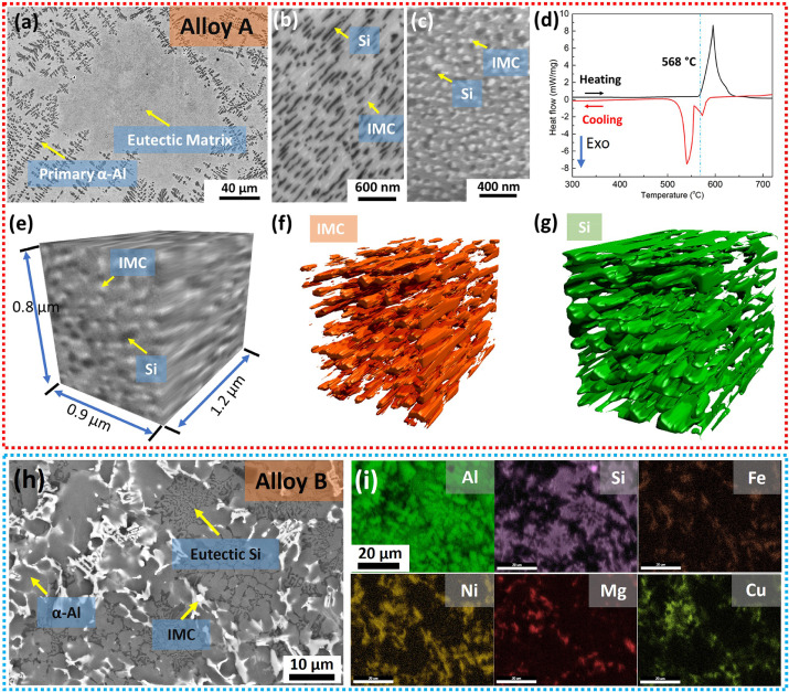 图1.(a)SEM透镜图像显示合金A的微观结构(b,c)从共晶细胞不同方向的高放大的SEM透镜图像,显示Si和金属间化合物(IMC)(d)合金A的DSC加热和冷却曲线;从FIB-SEM技术获得的共晶相的3D形态(e)α-Al、Si和IMC的3D结构,没有分割(f)金属间化合物的分割(IMC)(g)Si的分割;(h)合金B的SEM反向散射图像(i)合金B的SEM EDX映射。