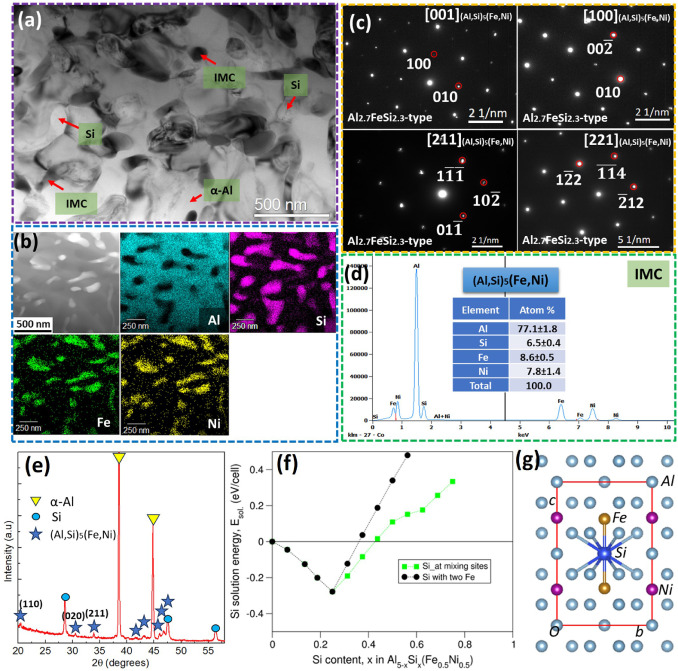 图2.(a)TEM亮场图像显示共晶区域的微观结构(b)HAADF-STEM图像和共晶相的元素分布(c)IMC的SADP(d)IMC的TEM EDX点分析;(e)合金A的XRD光谱;(f)高度稳定配置的Si内容物上的Si溶液能(g)最稳定的示意图结构(Al4.75Si0.25)(Fe0.5Ni0.5)。