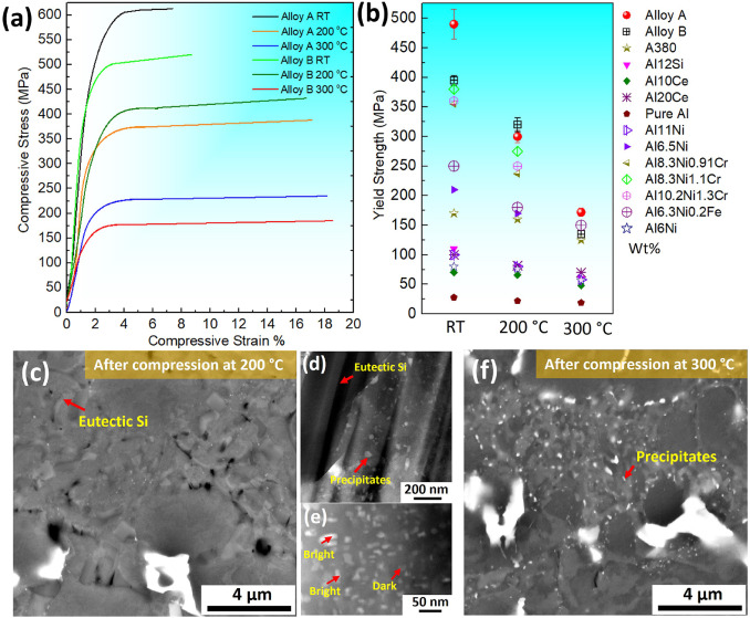 图4.(a)合金A和合金B的室温(RT)和高温压缩曲线(b)合金A、合金B和其他一些铝合金的屈服强度与温度;合金B在200°C压缩测试后的微观结构(c)共晶区的SEM反向散射图像,低倍率(d)和高倍率(e)下α-Al沉淀物的HAADF-STEM图像;(f)在300°C压缩测试后合金B中射区的SEM反向散射图像。