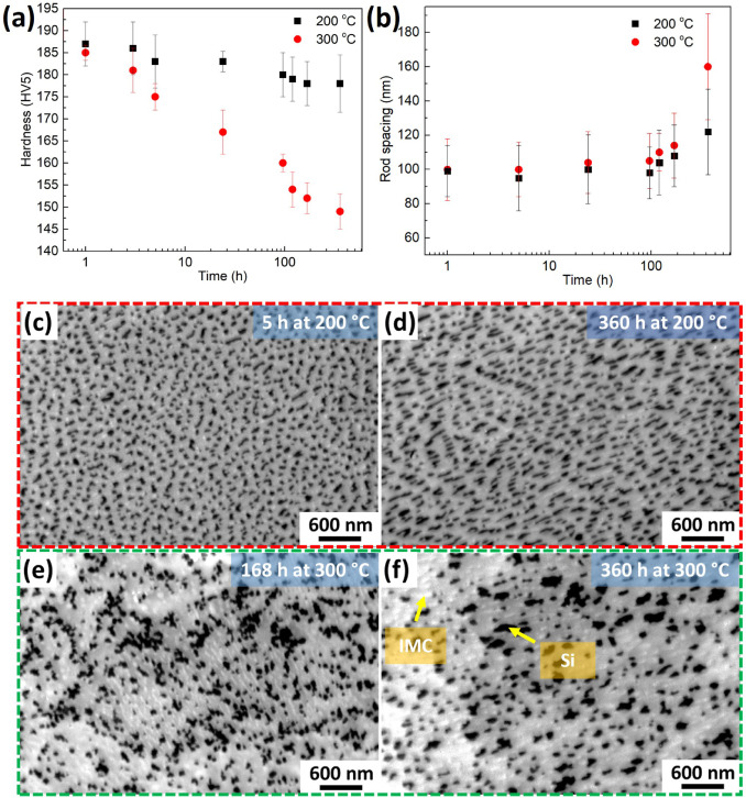 图3.(a)合金A在不同时间在200°C和300°C退火后的不同时间的维克斯硬度(b)在不同时间在200°C和300°C退火后IMC的杆间距;SEM透镜内图像显示合金A在200°C退火5小时(c)退火后,在200°C退火后360小时(d),在300°C退火后168小时(e)在300°C退火后360小时(f)的微观结构。