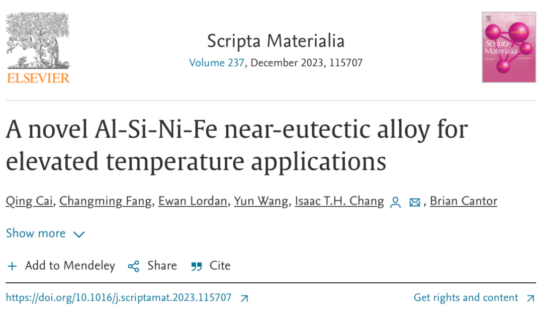 耐热铝合金的发展一直是一个持续的主题,能够在各种工作条件下扩大其应用。它们的用途之一是发动机部件,如活塞和气缸盖。它要求合金在高温下具有低热膨胀、高耐磨性、良好的铸造性和优异的机械性能。目前,大多数商业合金都是基于具有11-16%Si的二元Al-Si共晶系统设计的,添加一些其他元素,包括高达1.3%的Fe、0.5-5.5%的Cu、0.5-3%Ni和0.6-1-3%的Mg(wt%)能够进一步提高其机械性能。详细来说,添加大量Si有助于其低热膨胀、出色的铸造性和良好的耐磨性。铁和镍的添加可以导致相互连接的含铁和含镍的金属间化合物(IMC)的形成,具有高热稳定性。此外,在α-Al中具有高溶解度的Cu和Mg能够在老化后提供沉淀硬化。θ'-/θ''-Al2Cu,β'-Mg9Si5/ β''-Mg5Si6和Q'/Q(AlCuMgSi)沉淀物通常在这些合金中。然而,由于Cu和Mg在高温下在α-Al中的高扩散性和溶解度,当暴露在250°C以上的温度下,这些沉淀物对合金的机械性能的影响有限。关于在高温(>250°C)下增加合金的强度,耐热IMC起着主导作用。