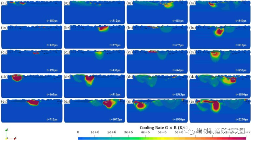 图12显示了各种型号的冷却速率图,所有这些都是从扫描轨迹的中心拍摄的。由于在这些模拟中激光束运动的轨迹不同,只选择了四个部分来检查横截面附近的冷却速率变化。熔池内部的冷却速率明显高于边缘,如图12(b4,c2)。此外,在相邻轨道扫描之后的热效应导致更深的区域经历冷却。此外,图12(d1,d4)和(e1,e4)表明,岛状扫描的冷却速率高于往返扫描。除M67外,在其他策略中,未重熔区的冻结率显著低于重熔区。这归因于第一次扫描后固化流的传热系数更显著,这导致更快的热扩散、相对较小的熔池体积以及重熔过程中更高的冷却速率。由于重熔区的凝固速度更快,最终结果将是局部区域的硬度相对较高,与纳米压痕测试结果一致。然而,应该注意的是,由于两个轨道的中心被选择在固液界面,所获得的数据将略高于LPBF实验中测量的冷却速率(105–106 K/s)。此外,除了冷却速率外,本研究还检查了温度梯度和温度梯度与生长速率的比率(G/R),如补充信息所示。观察到,与其他模型相比,CB2策略具有更高的平均G/R值(图S3),这意味着成分过冷不太明显,随机晶粒形成的可能性较小,从而导致更明显的微观织构。