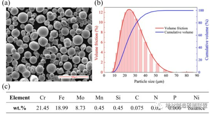 图1(a)气雾化制备的 HX合金粉末形态(b)粉末粒度分布(c)LPBF制备的HX合金成分。