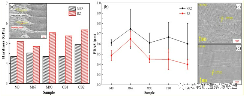 图9(a)竣工样品的纳米硬度值(b)不同样品的PDAS,分别代表M0、M67、M90、CB1和CB2(c)CB2试样NRZ的PDAS测量图(d)CB2试样RZ的PDAS测量图。