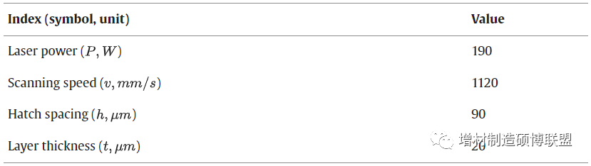 在增材制造之前,对直径在20-60μm范围内的粉末进行干燥,随后打印10×10×5mm的HX样品。保护气体为氮气,基板为预热80 ℃的45#钢。在打印过程中采用了基于初步测试确定的一系列优化参数,并总结在表1中。