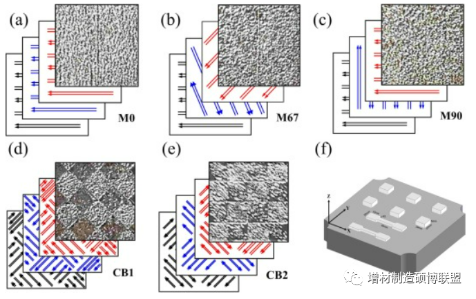图2(a-e)不同扫描策略的示意图,分别为M0、M67、M90、CB1和CB2,以及(f)实际样本的示意图。