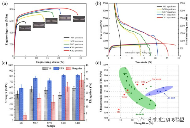 图7(a)工程应力-应变曲线和五个拉伸样品的宏观照片,(b)五个拉伸样本的真实应力-应力曲线和应变硬化率曲线,(c)不同扫描策略的拉伸性能,分别代表M0、M67、M90、CB1和CB2,(d)激光重熔HX合金的UTS与伸长率和以前的文献值。