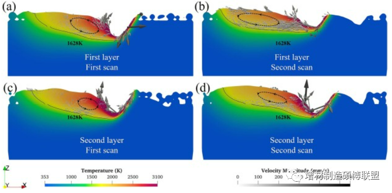 图10显示了两个粉末层的两次扫描的温度-速度场分布。熔融金属的蒸发在一定程度上发生在与粉末的激光接触区的前部,这是由于在小区域内积累了大量的热量,导致温度高于蒸发点。尽管如此,较厚的光斑直径和中等的激光能量密度导致了气泡的不存在。如黑色轮廓线所示,由于熔池尾部的流速较弱,激光束的移动和蒸发产生的反冲压力在熔池内部引起了显著的逆时针Marangoni对流。此外,由于固体的传热系数大于氮气的传热系数,由重熔扫描产生的熔池体积小于由第一次扫描产生的熔融池体积,通过比较图10(b,d)和图10(a,c)可以明显看出。