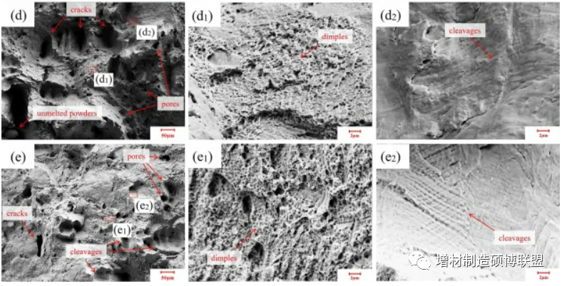 为了进一步讨论增强性能的性质,通过SEM观察研究了五个拉伸部件的断裂表面形貌,如图7(a)。根据图8(a-e)的形态信息,每个样品的断裂表面都存在裂纹和孔隙。M0、M67、M90和CB1的SEM图像中明显出现了许多残留的未熔融颗粒,这与先前的OM结果相似。至于CB2本体,图8(e)中捕捉到几乎不存在球形粉末。图8(a1-e1)和图8(a2-e2)分别是拉伸断裂的较高放大率。值得注意的是,凹坑是主要的微观结构特征,这是这些建成块中发生韧性断裂的证据。此外,在M0样品中,在孔附近也很少产生类似解理的区域。解理面的存在意味着准解理断裂的开始。毫无疑问,M0的伸长率正在下降到CB2试样的约12%。然而,解理状表面可能不仅仅是解释极弱延展性的原因,而且凹坑的大小也可以在解释两种制造之间的性能差距方面发挥作用。CB2样品内部凹坑的平均尺寸略大于M0样品(M0:0.410μm和CB2:0.646μm)。由于CB2断裂中出现了韧窝和解理面的混合物(图8(e1,e2)),韧性-脆性协同断裂机制值得更多关注。此外,在补充信息中提供了与颈缩区域相邻的拉伸样品的详细分析。更重要的是,CB2试样的位错密度升高率相对高于M0试样,这也符合CB2拉伸试验中更好的伸长率(分别为M0:16.7%和CB2:159.2%)。