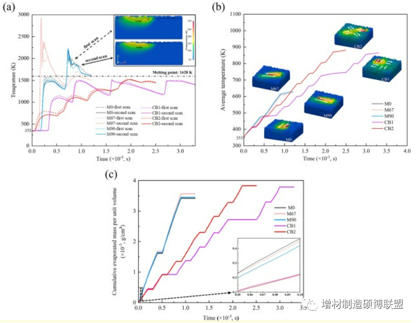图11 不同扫描时间和不同样品的温度-时间曲线分别表示M0、M67、M90、CB1和CB2(a)模型中心点的瞬态温度曲线(b)模型的平均温度曲线和(c)模型的每单位体积的累积蒸发质量。