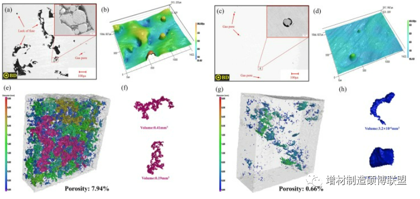 图3(a)(c)M90试样和CB2试样的OM图像(b)(d)M90标本和CB2标本的粗糙度照片,M90(e)和CB2(g)试样的缺陷分布图像,以及M90(f)和CB1(h)试样的孔隙放大率。