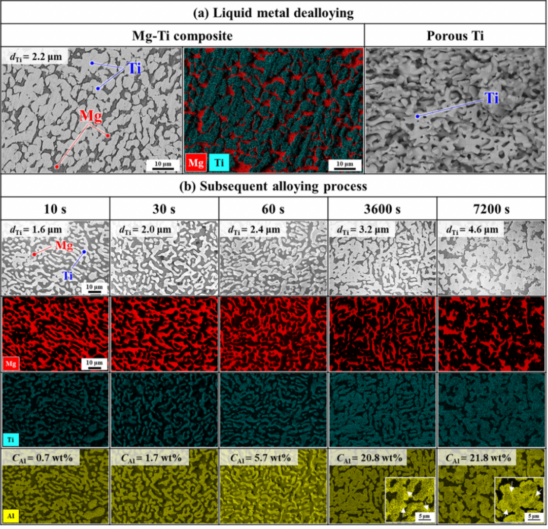 图3 .在FE - SEM和EDX元素图中观察到3D互连结构:( a ) LMD制备的Mg - Ti复合材料和多孔Ti;( b )后续合金化10 ~ 7200 s制备的三相( Mg、Ti3Al、Ti Al)复合材料。dTi表示Ti基体的平均宽度。