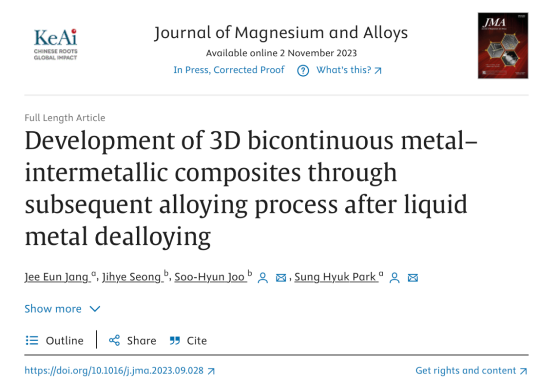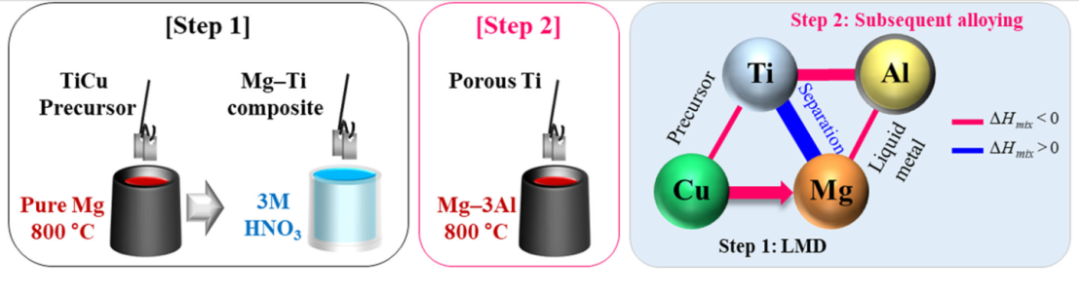 在本研究中,檀国大学Soo-Hyun Joo教授团队提出了继LMD工艺之后的后续合金化工艺。首先,利用LMD技术合成了开孔多孔Ti,然后将其浸入二元Mg - 3Al ( wt % )熔体中制备了三维连通复合材料,系统地研究了Al的合金化行为、金属间化合物的相变以及后续合金化过程中的组织演变。此外,本研究使用维氏硬度和压缩测试来测量所开发的复合材料的力学行为。相关研究成果以题“Development of 3D bicontinuous metal–intermetallic composites through subsequent alloying process after liquid metal dealloying”发表在Journal of Magnesium and Alloys上。