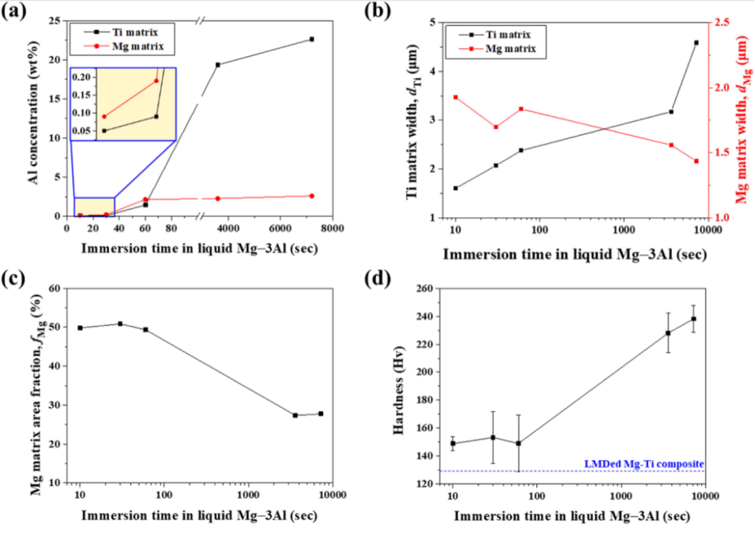 图4 .复合材料的显微组织和硬度随Mg - 3Al熔体中浸泡时间的变化:( a ) Ti和Mg基体中的Al浓度,( b ) Ti和Mg基体的宽度,( c ) Mg基体的面积分数,( d )复合材料中心区域的维氏硬度。
