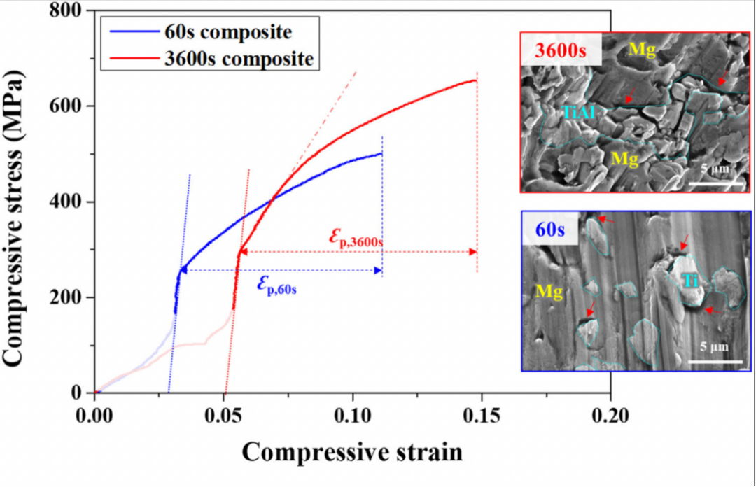 图7 .随后合金化60 s和3600 s制备的复合材料的压缩应力-应变曲线和SEM断口形貌。Φp,60s和Φp,3600s分别表示60s和3600s复合材料的塑性应变直至断裂。