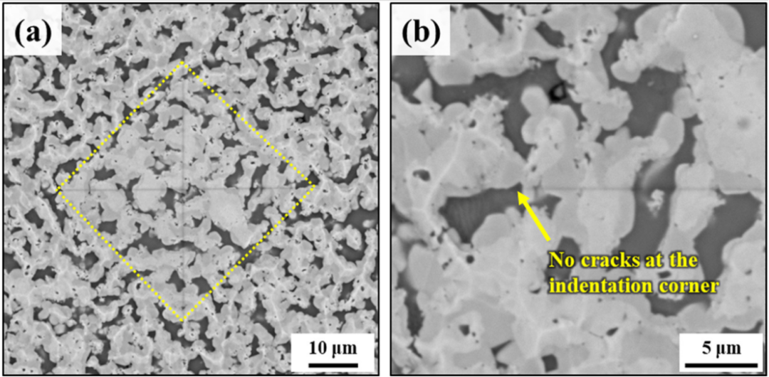 图6 . ( a )三维互连三相( Mg-Ti3Al-Ti Al)复合材料上的压痕标记和( b )压痕拐角处的高倍SEM图像。