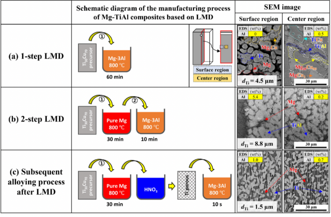 图5 .通过几种基于LMD的方法制备Mg - Ti ( Al )复合材料及其表面和中心区域的SEM照片:( a )使用Mg - 3Al熔体的典型一步LMD制备的复合材料;( b )使用纯Mg和Mg - 3Al熔体的连续两步LMD制备的复合材料;( c ) LMD后的后续合金化过程制备的复合材料(提出的方法)。