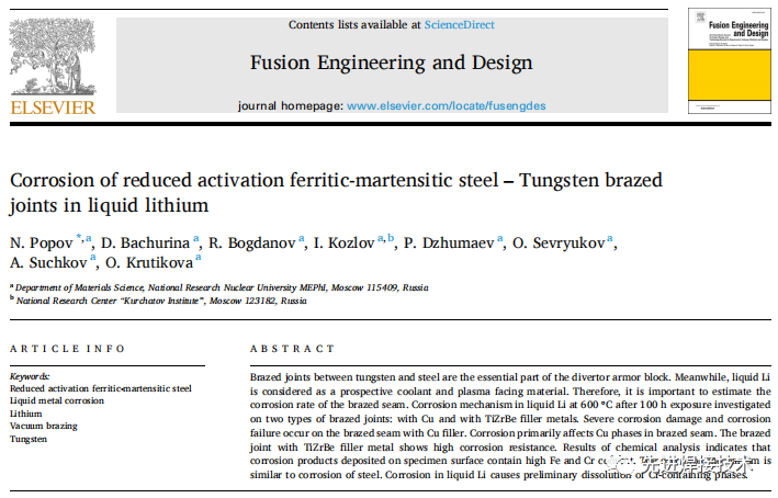 由俄罗斯国立核能研究大学-莫斯科工程物理学院的研究学者撰写的《Corrosion of reduced activation ferritic-martensitic steel – Tungsten brazed joints in liquid lithium 》文章近期发表在Fusion Engineering and Design期刊上,该文章面向未来热核聚变需求,研究了液态锂中还原活化铁马氏钢/钨钎焊接头的腐蚀行为和机理。