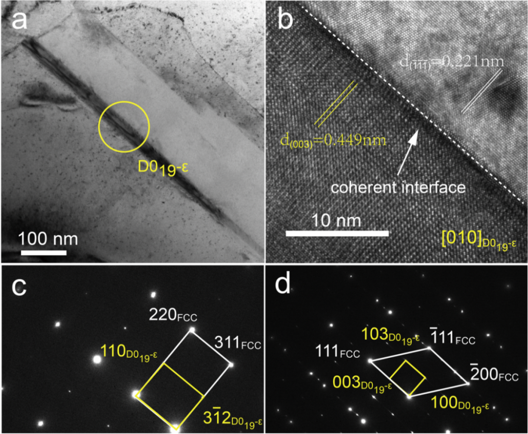 图3 . IHG中D019 -ε相的显微结构( a ) D019 - ε相的典型TEM - BF像。( b )[ 010 ] D019 - ε区轴的高分辨TEM像。( c、d)对应的SAED花样取自 FCC和[ 010 ] FCC区域轴显示D019 -ε和FCC基体之间的取向关系。