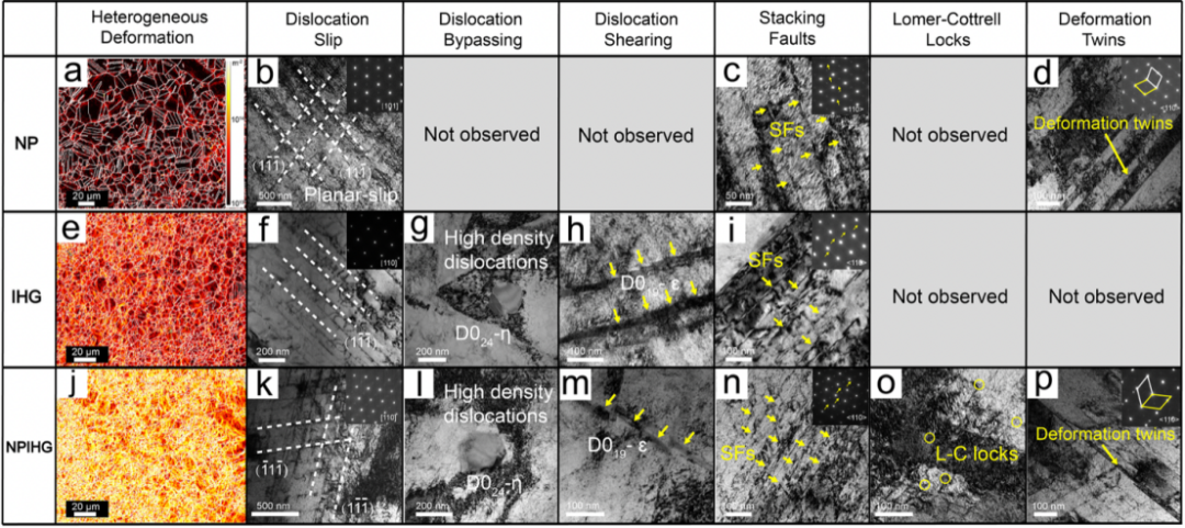 图6 . NP、IHG和NPIHG合金的变形组织。拉伸试验后近断口区域的( a , e , j)GND密度图。从轴上拍摄的( b , f , k) TEM - BF图像显示三种合金中都存在位错的平面滑移和交滑移特征。( g , l)的TEM - BF图像显示位错绕过D024 - η粒子。( h , m)的TEM - BF图像显示位错剪切D019 - ε针。( c , i , n)的TEM - BF图像取自轴位,显示纳米间隔的SFs (黄色箭头)。( o ) TEM - BF图像显示NPIHG合金中存在L - C锁。( d、p)的TEM - BF图像显示了NP和NPIHG中的形变孪晶。