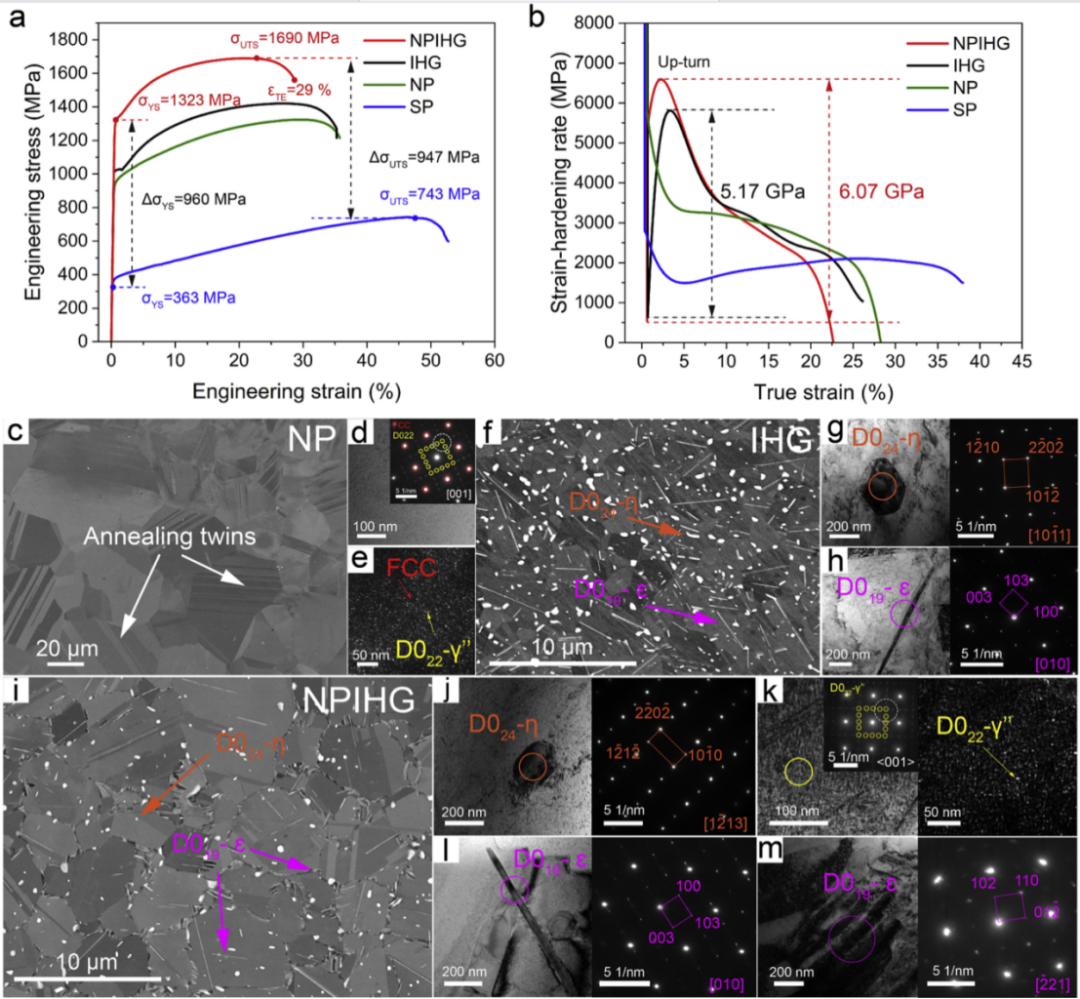 图1 .研究了不同形变热处理对Co30Cr20Ni40V5Ta5合金MEAs力学性能和微观组织的影响。( a ) SP、NP、IHG和NPIHG合金的拉伸曲线。( b )对应的加工硬化率( dσ/ dε)。分别得到了NP、IHG和NPIHG合金的( c , f , i)背散射电子( BSE )图像。( d ) NP合金的TEM明场像和插入的SAED图证实了NP合金中存在D022 -γ' '纳米析出相。( e ) ( d )中虚线圆点的TEM暗场像显示高密度的D022 -γ' '纳米析出相均匀分布在FCC基体中。( g , h) TEM - BF图像圆圈区域的SAED花样显示了IHG合金中球状的D024 -η相和针状的D019 - ε相。( j-m ) TEM-BF / DF图像和SAED花样显示NPIHG合金中D024-η、D022-γ' '、D019 -ε( l在FCC晶粒内, m在晶界处)。