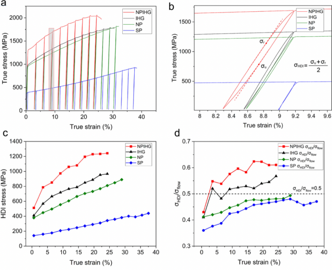图8 .引入非均匀变形( HDI )硬化的量化。( a ) SP、NP、IHG和NPIHG的加载-卸载-再加载( LUR )循环拉伸真应力-应变曲线。( b ) ( a )中阴影区域典型滞回环的扩大视图。( c )比较SP、NP、IHG和NPIHG合金的HDI应力( σHDI )和( d ) HDI应力与流动应力的比值( σHDI / σflow )。