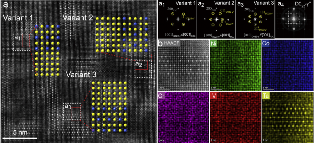 图4 . D022-γ ' '的显微组织和成分。( a )取自[ 001 ]晶带轴的NPIHG合金的典型HAADF - STEM像。D022-γ ' '变体和FCC基体的原子晶格示意图重叠在( a )上。蓝色球代表较亮的原子柱,黄色球代表较暗的原子柱。( a1 ~ a3 )对应( a )中虚线白色方块所包含的3个变体的FFT图。( a4 ) ( a )中整个HAADF - STEM图像的FFT模式包含所有D022-γ ' '的三个变体。( b )原子分辨EDS图谱显示了D022-γ ' '和FCC的原子柱中元素的相对浓度。