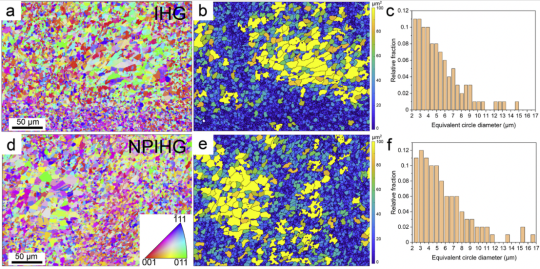 图2 .未变形状态下IHG和NPIHG的异质晶粒结构。( a , d) IHG和NPIHG的典型X方向( IPF-X ) EBSD逆极图。( b , e)的IHG和NPIHG的籽粒面积图。( c , f)为IHG和NPIHG中晶粒等效圆直径的相对分数。