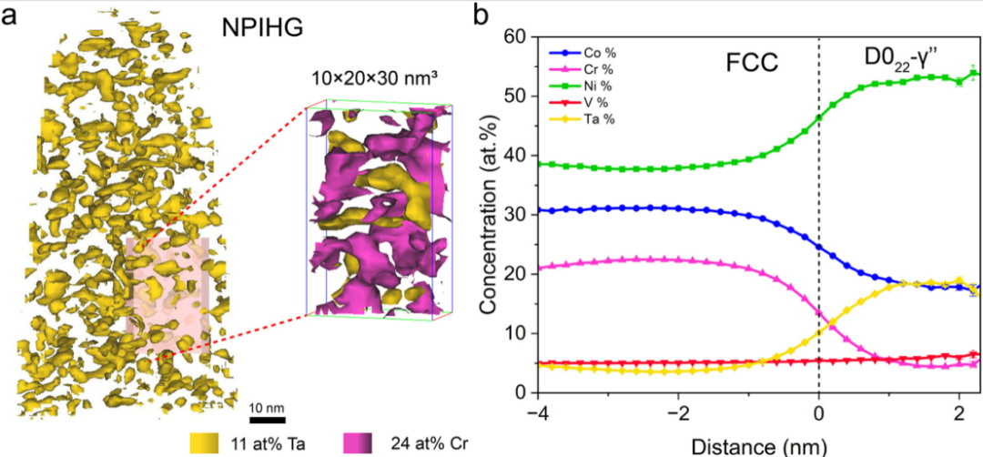 图5 . ( a ) 3D - APT重建的11 at . % Ta和24 at . % Cr等浓度面呈现了典型NPIHG样品中D022-γ ' '和FCC基体的形貌和分布。( b )在11 at . % Ta等浓度参考面上,使用0.2 nm的面元尺寸创建了邻近直方图(近程图)。