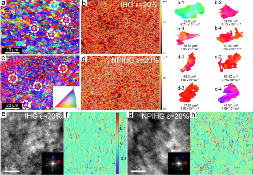 图9。( a , c) IHG和NPIHG合金的典型X方向( IPF-X ) EBSD逆极图。( b、d)在20 %应变下对应的GND密度图。比较了IHG ( b-1 , b-2 , b-3 , b - 4)和NIPHG ( d - 1、d - 2、d - 3、d - 4)中大小相近的4个典型大颗粒的晶内剪切带平均GND密度。这些晶粒也用相应的编号标注在a和c中。( e-h )高分辨TEM图像和相应的几何相位分析( GPA )图像分别揭示了IHG合金和NPIHG在20 %应变下的水平正应变( εxx )。红色和蓝色圆圈分别表示GPA方法中水平( x )和垂直( y )方向选取的g向量。