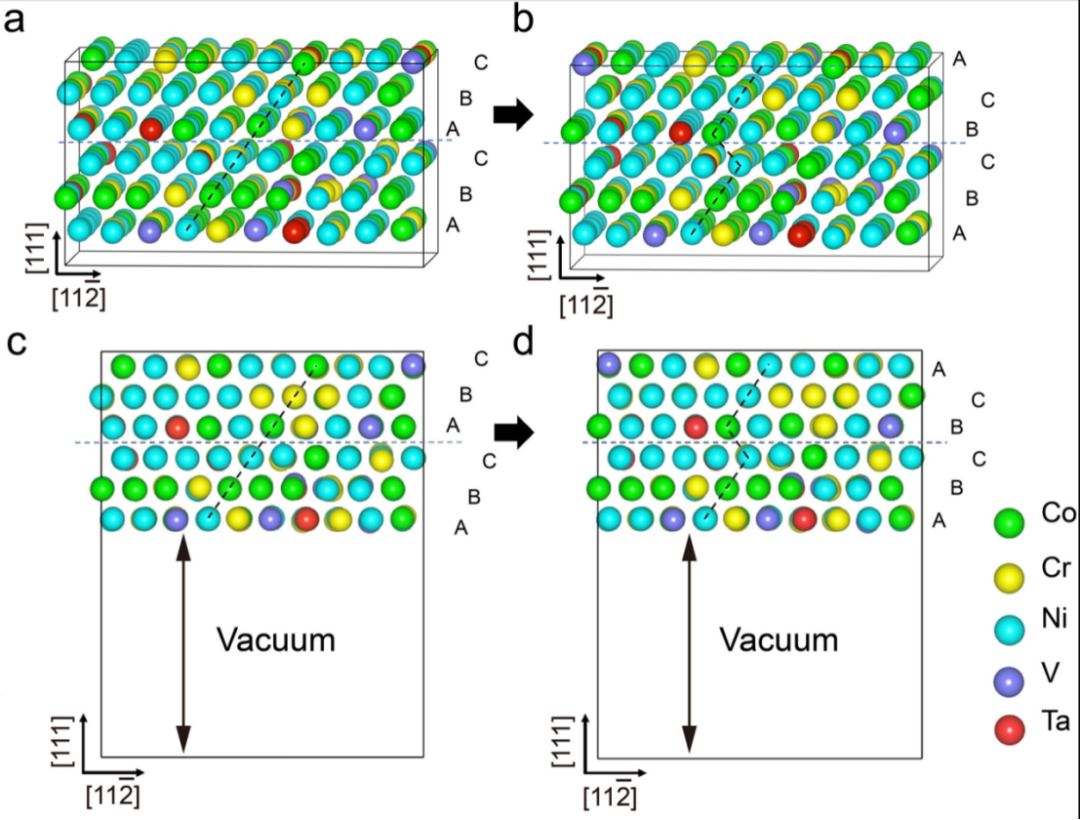 图7 . ( a , b)原始fcc结构和具有本征层错(每个分子含300个原子)的缺陷结构。( c、d)分别为( a )、( b )中原子构型的侧视图。